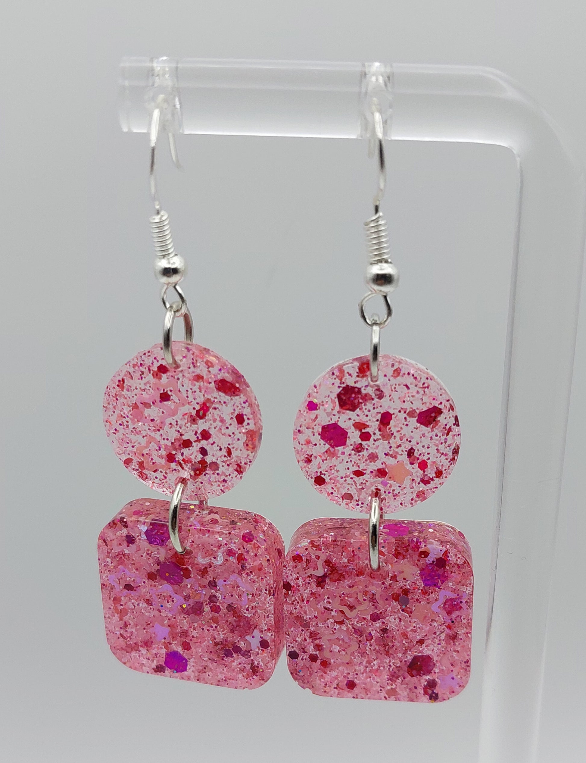 Cute clear and pink glitter in a square and round design. Cute and lightweight!