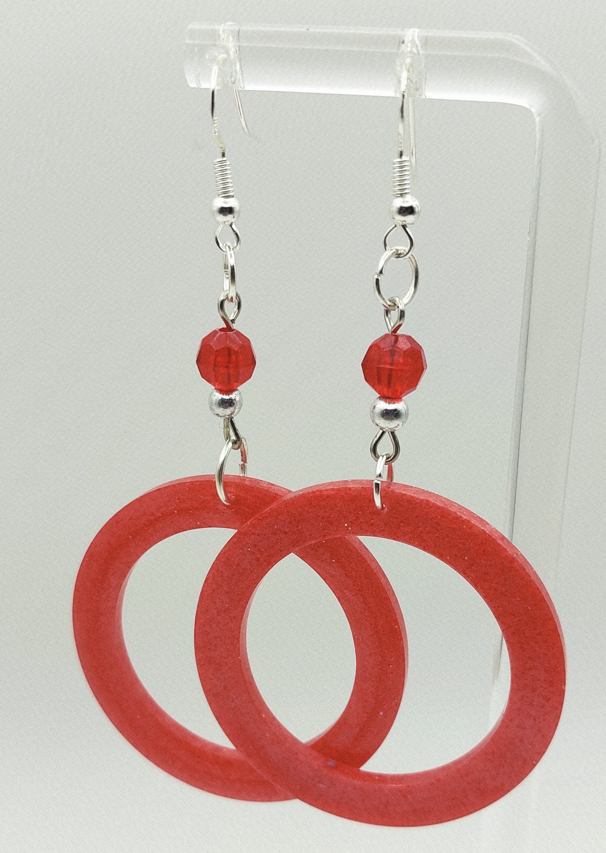 Chunky red hoops and beads with a playful retro vibe.