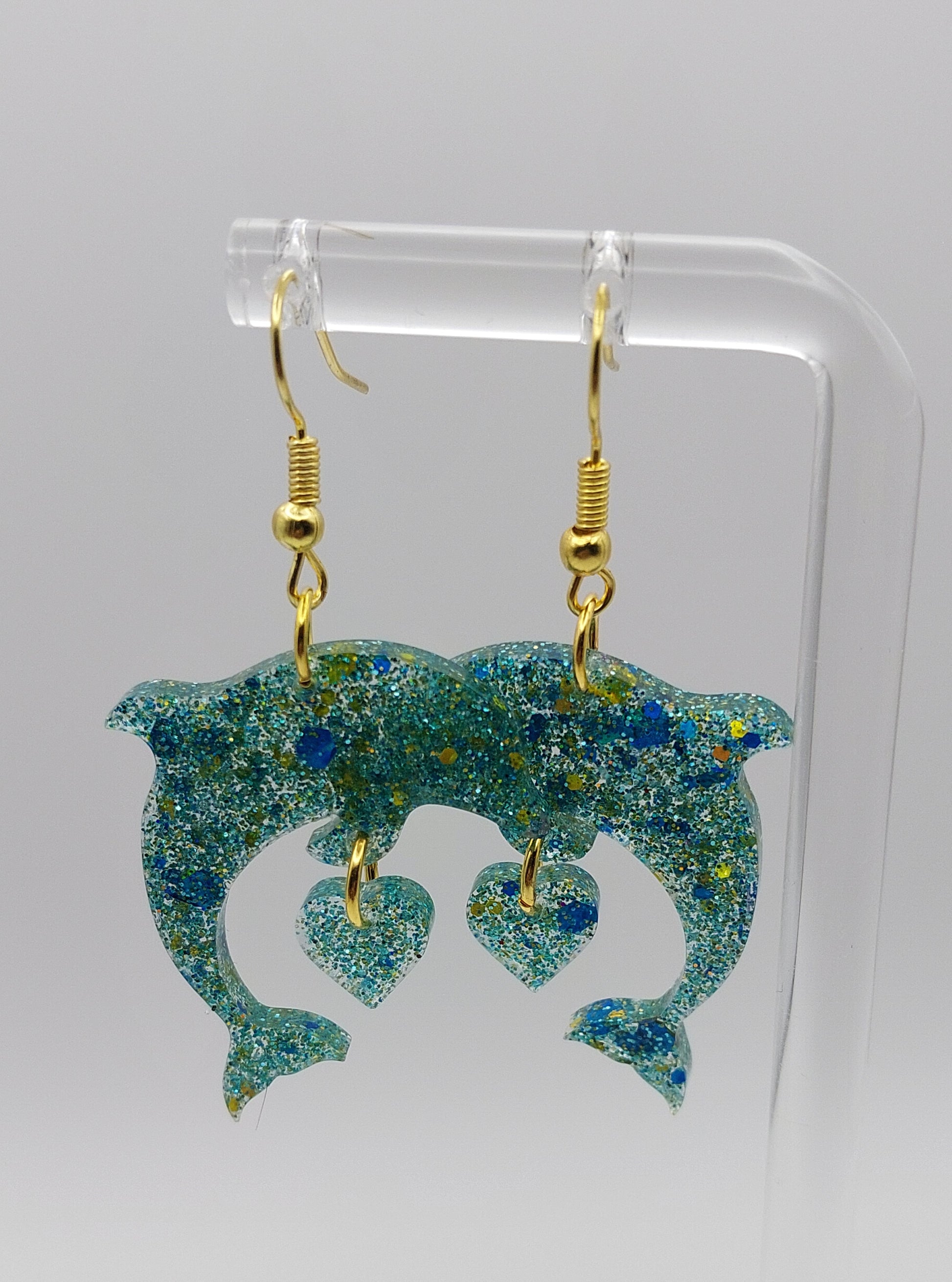 Playful glittery dolphin earrings with dangling heart charms. Approx. 2.2" long.