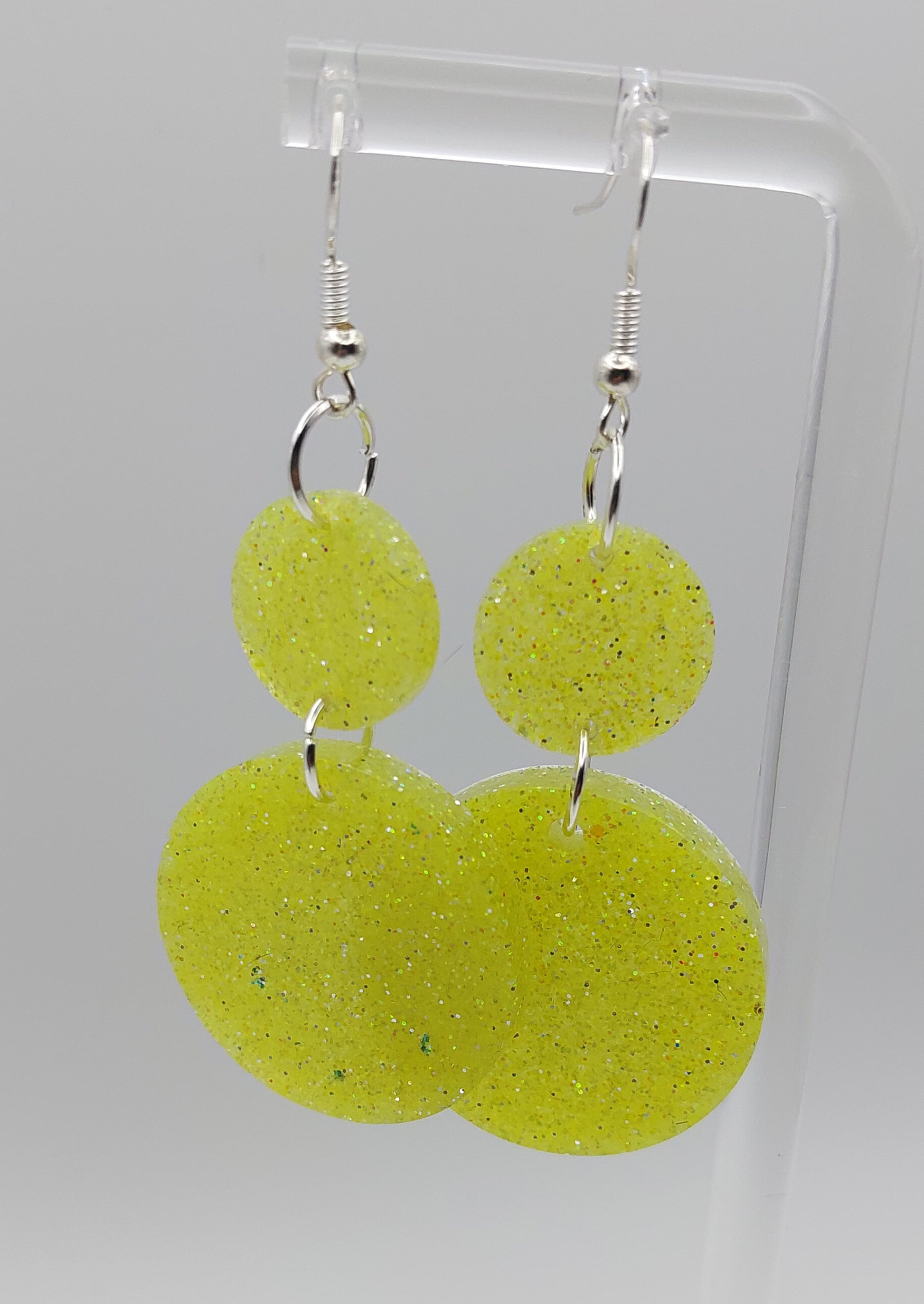Sweet and sparkly double circle dangles with a light yellow shimmer. Light, flirty, and full of charm. Approx. 2.75" long.
