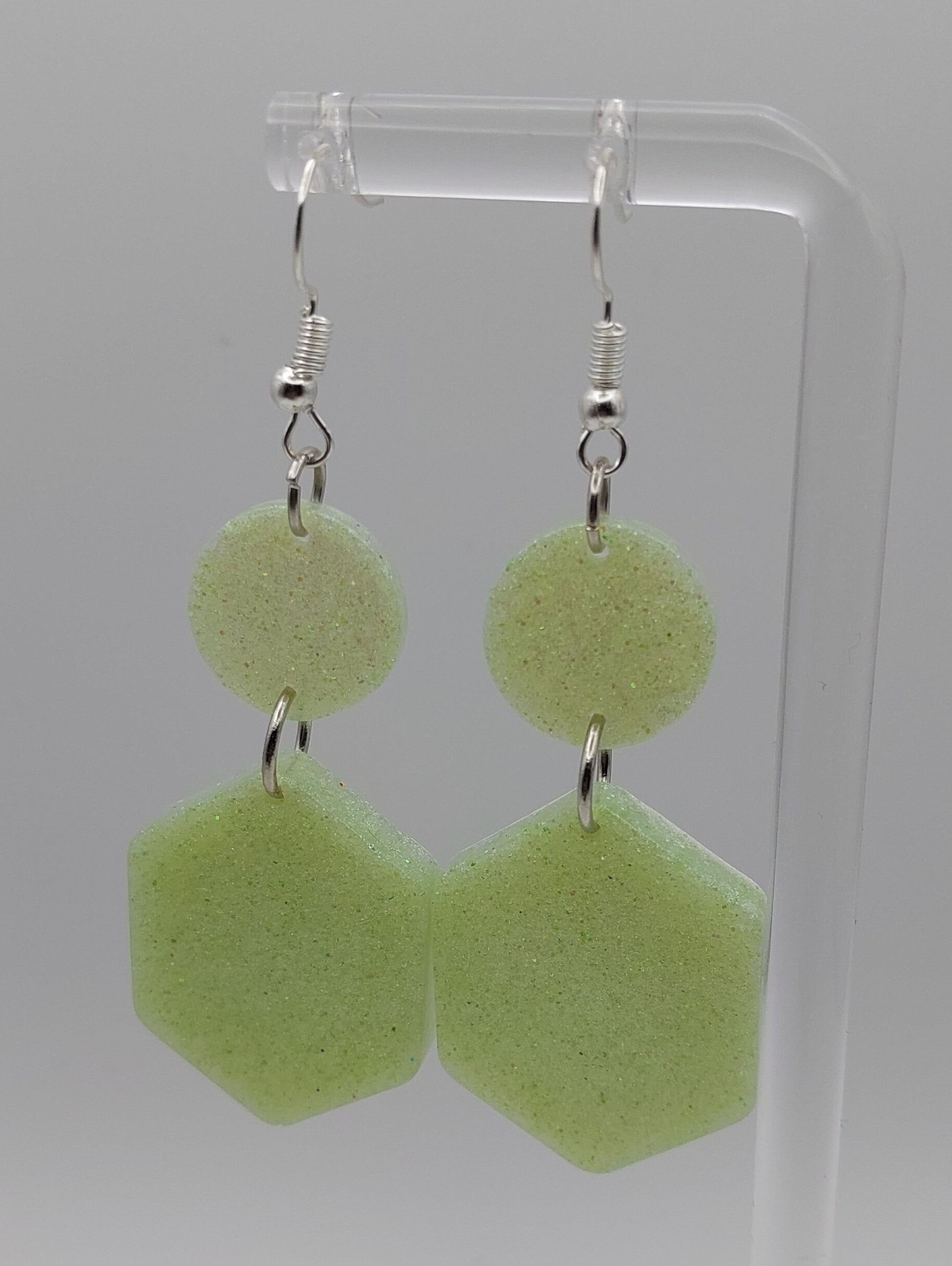 earrings feature a modern geometric design, combining a circular stud with a dangling hexagonal element. Crafted from lightweight resin in a vibrant lime green shade with a subtle speckled finish.