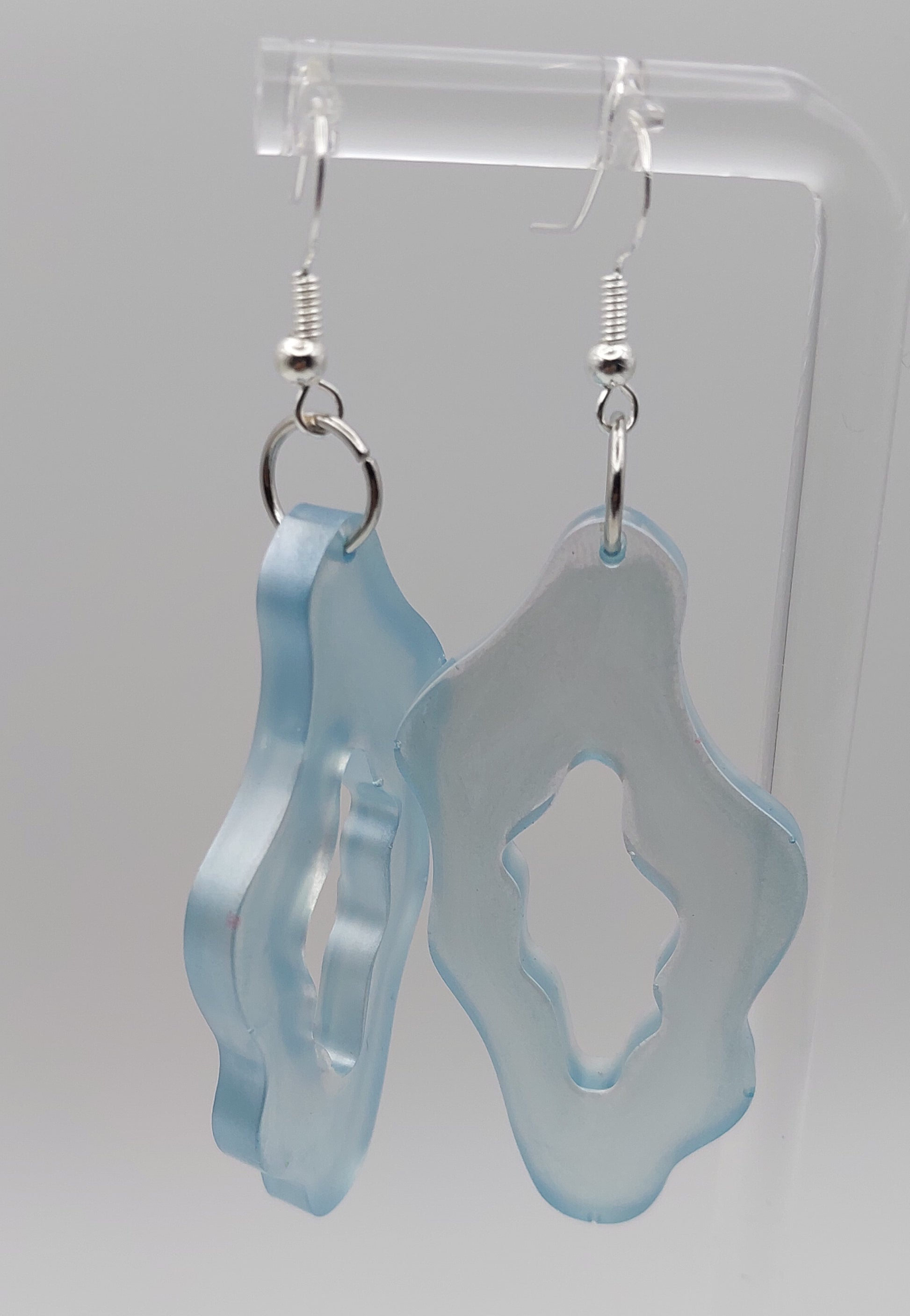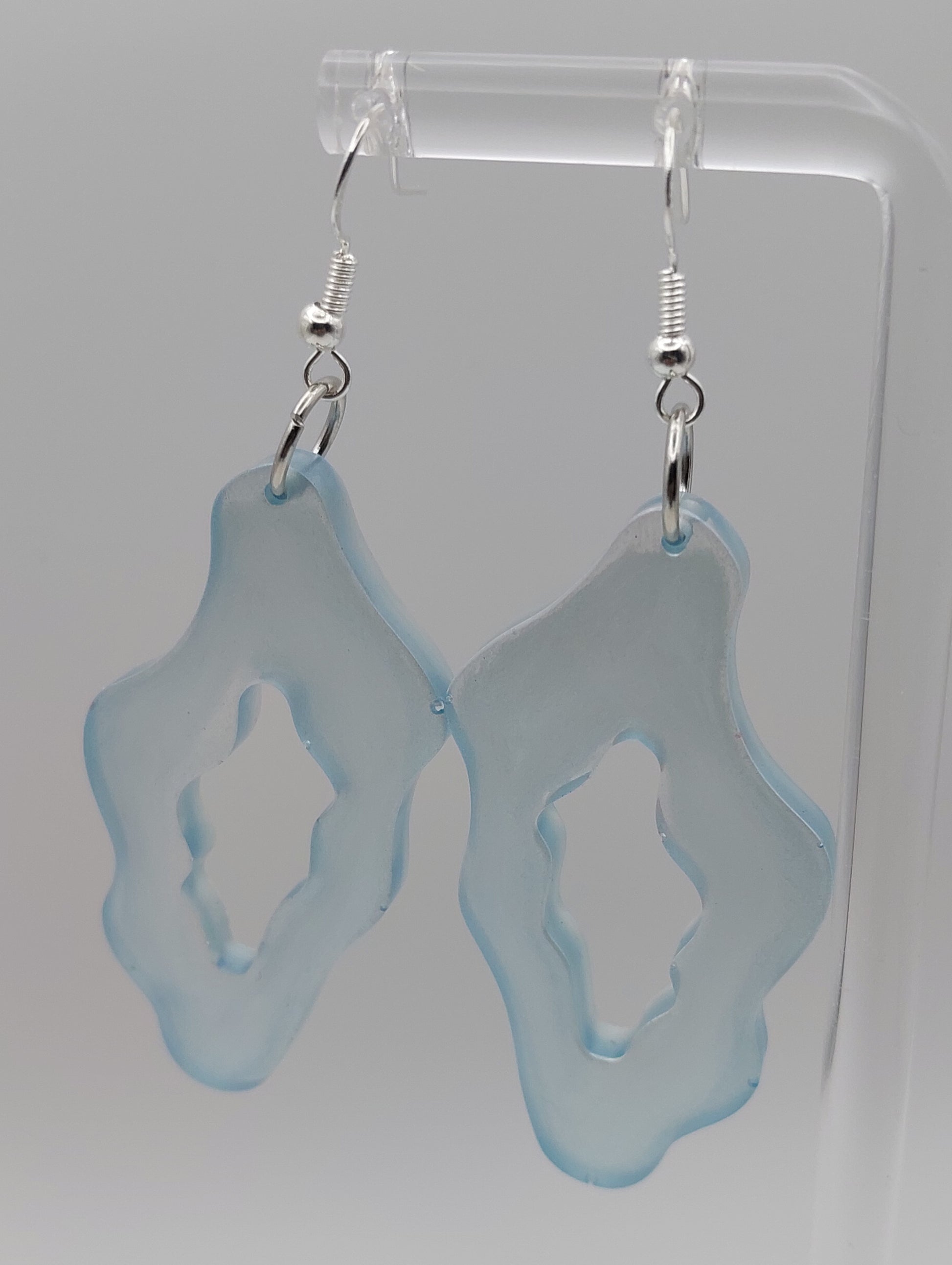 These ethereal earrings capture the gentle ebb and flow of ocean waves with their unique, organic shape and translucent, calming blue hue. Their subtle yet distinctive design evokes the feeling of sea glass polished by the tides, making them a perfect accessory for adding a touch of tranquil, ocean-inspired elegance to any outfit.