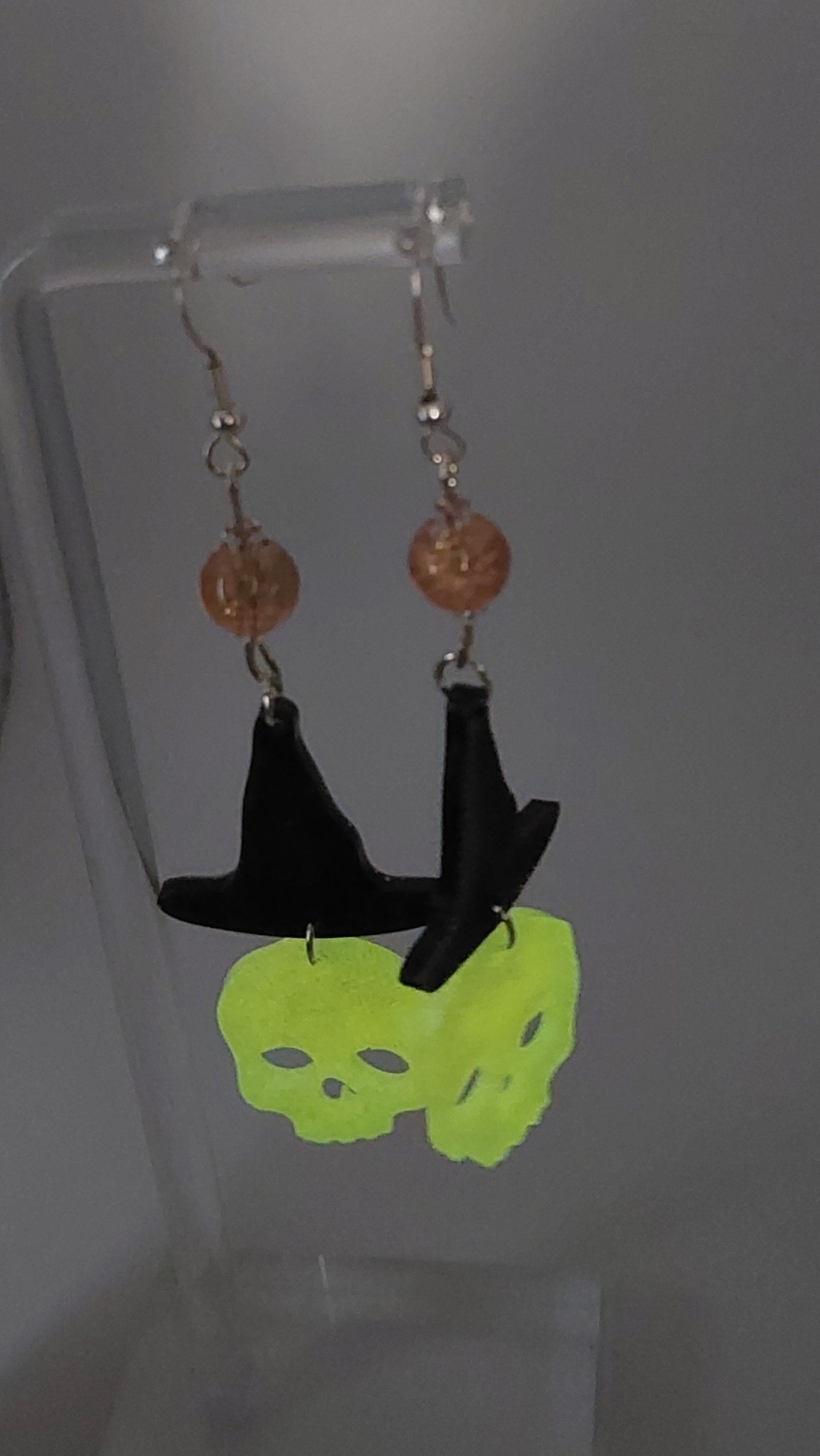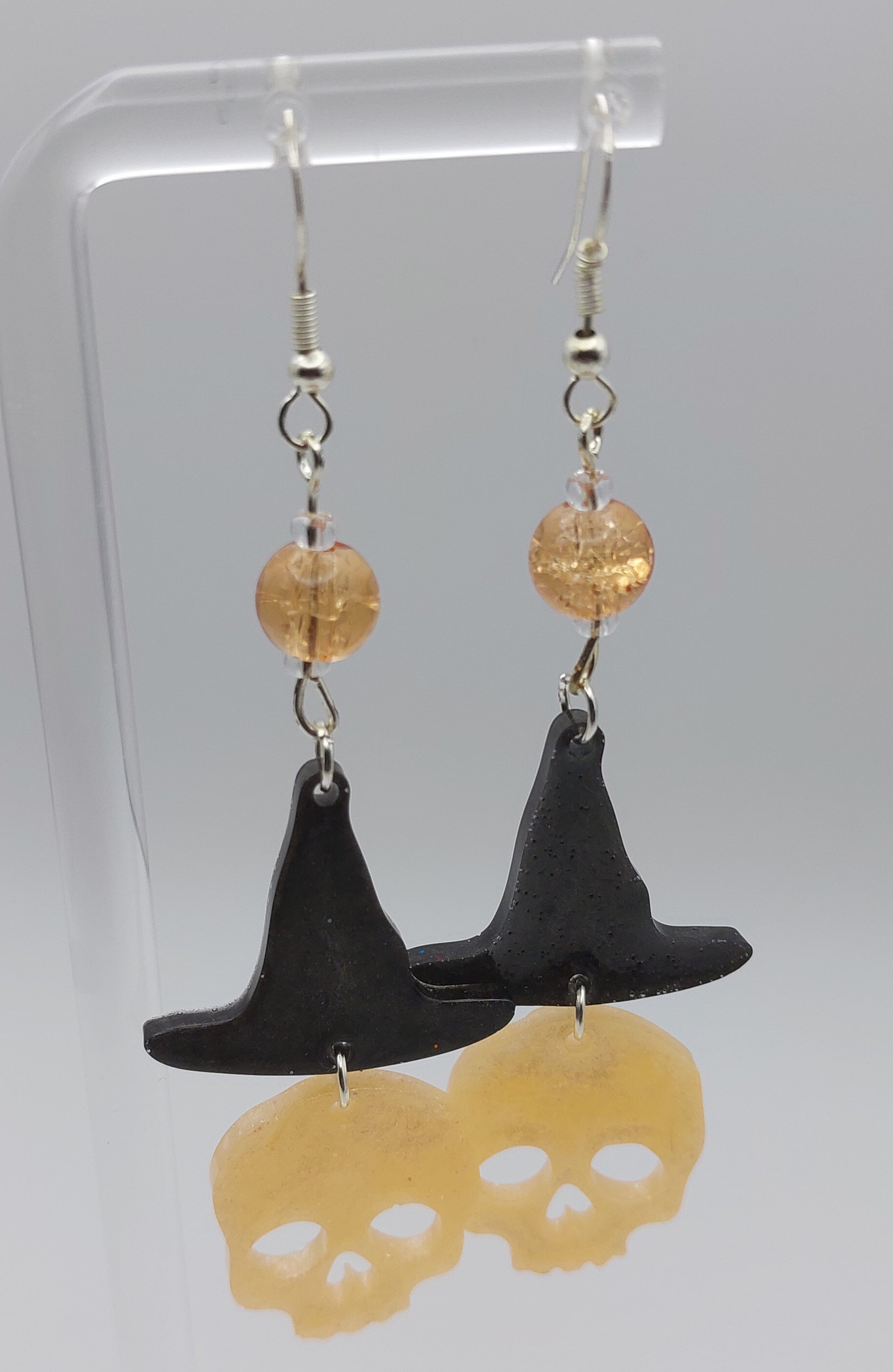 Classic black witch hats paired with skull drops and autumn-orange crackle beads. Choose the warm amber look for day or the glowing green skulls for a spooky nighttime effect. 🎃✨🌙