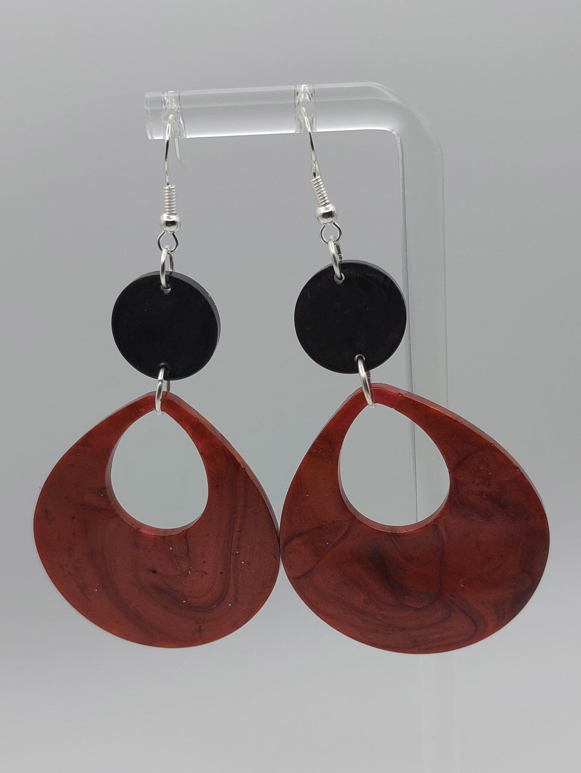 Bold and stylish, these handmade dangle earrings feature a glossy black circle paired with a rich, marbled reddish-brown teardrop. Lightweight and eye-catching — perfect for everyday wear or a standout statement.
