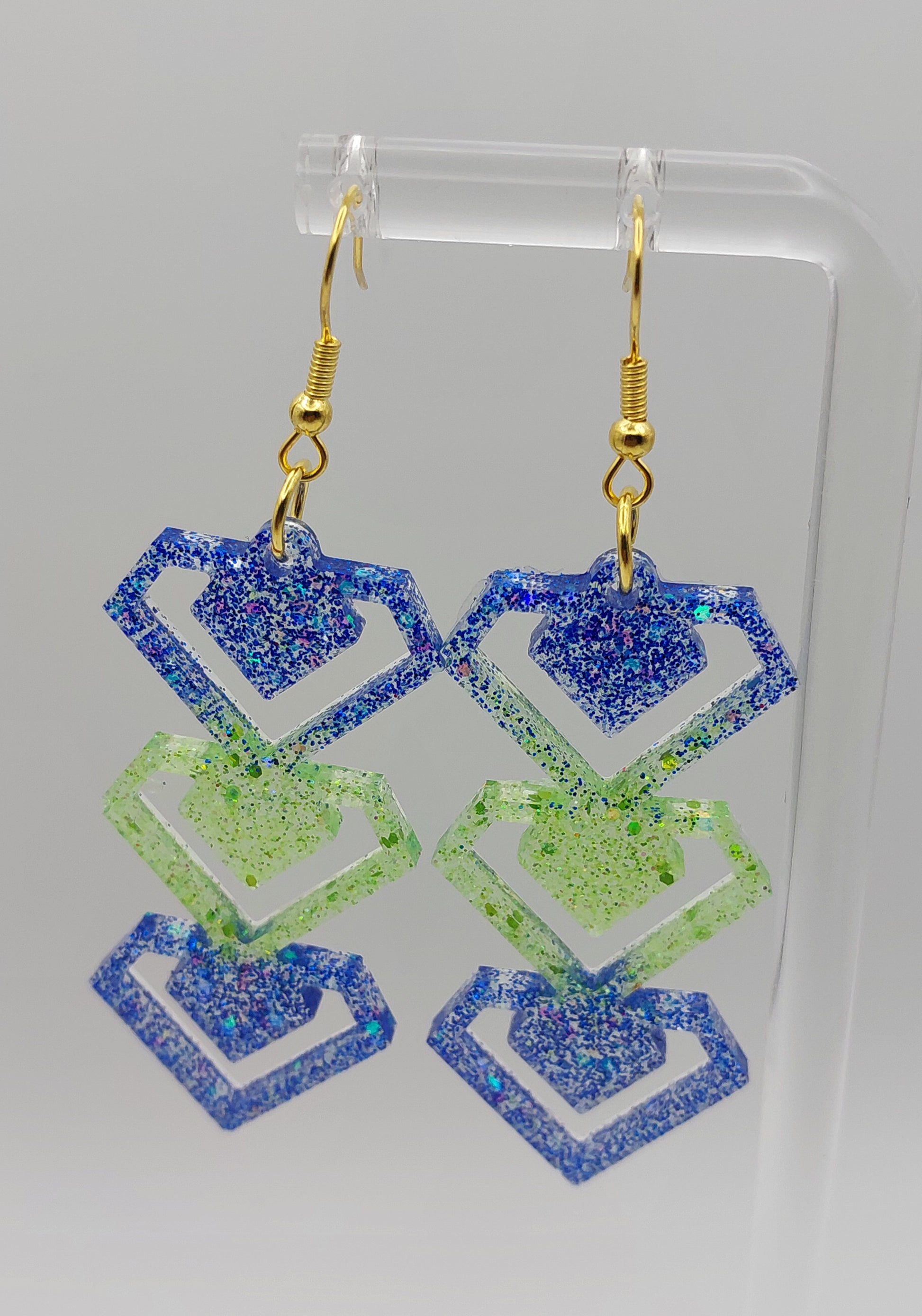 Bold stacked blue and green glitter diamonds with gold hooks. Approx. 2.8" long.