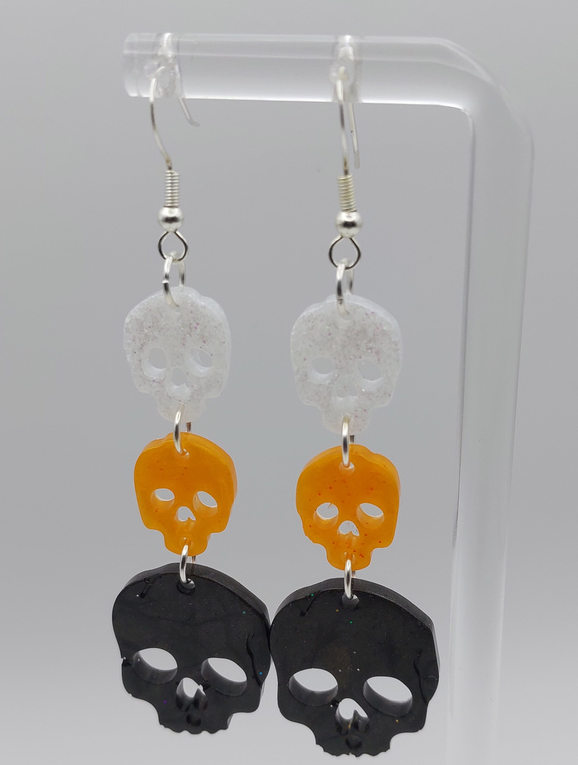 Bold and spooky-cute! These handmade earrings feature a trio of glittery white, pumpkin orange, and deep black skulls stacked in a playful Halloween cascade. ๐ป๐งก๐ค