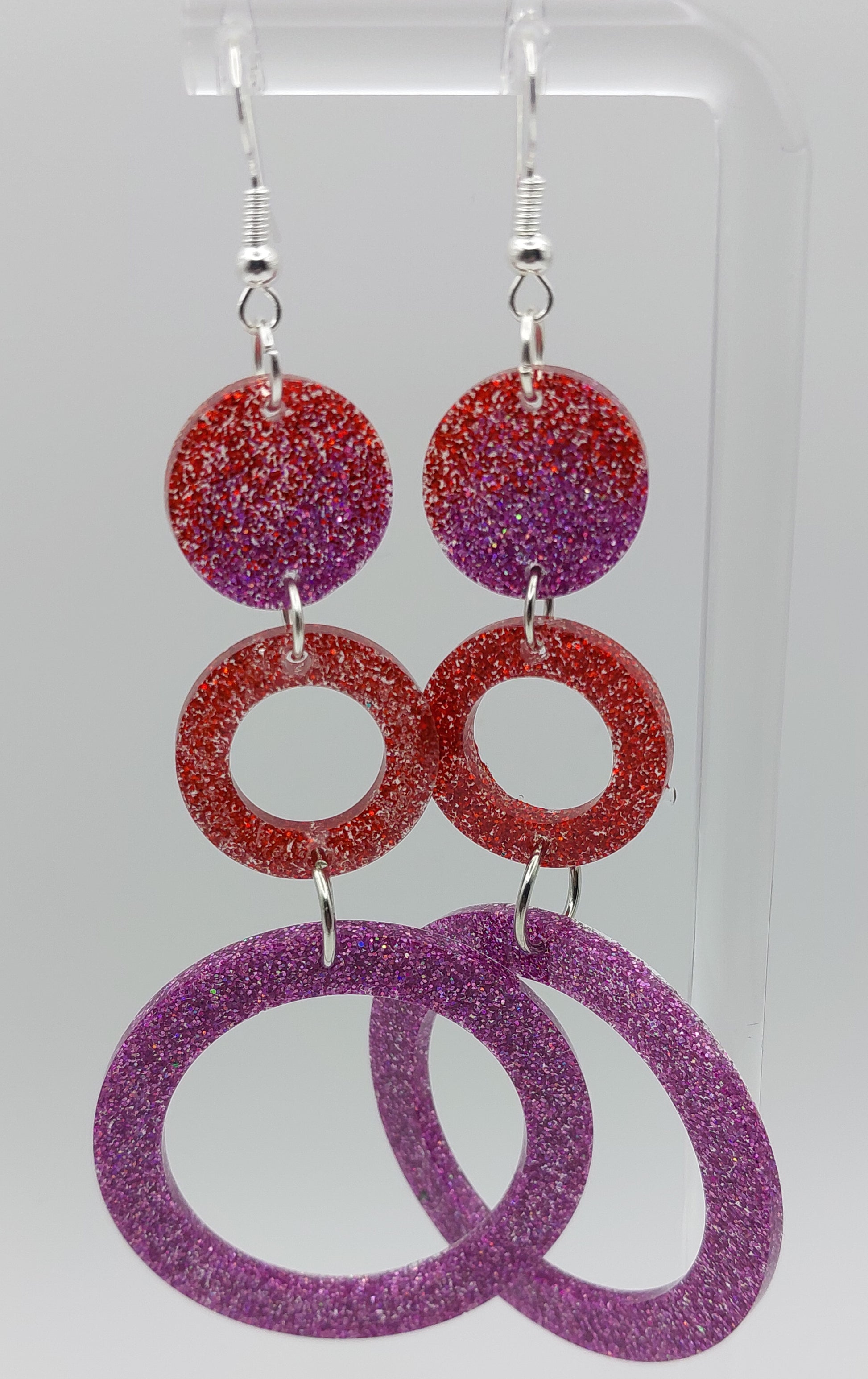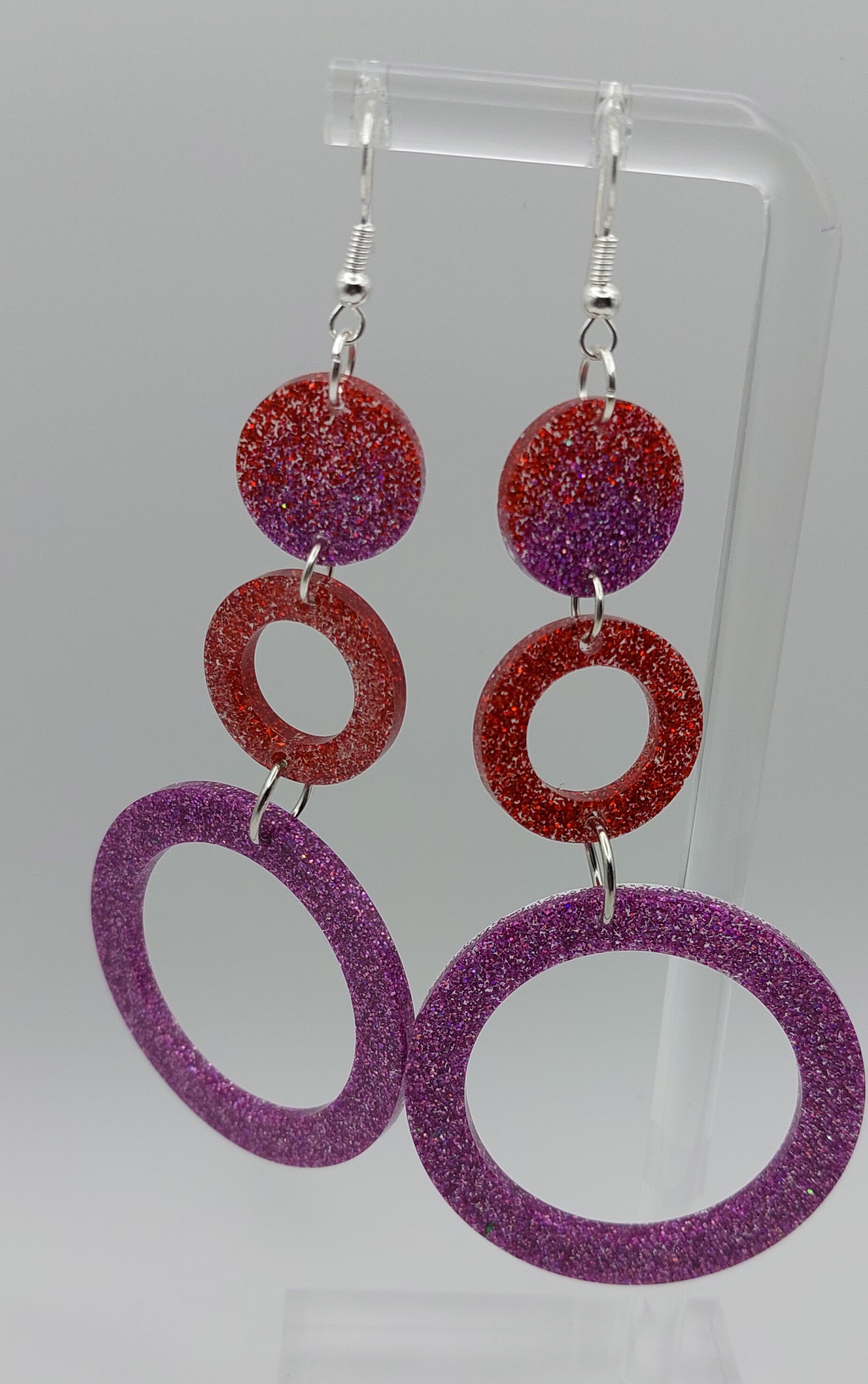 Red, purple, glitter in triple circle shape drop earrings! Lightweight.