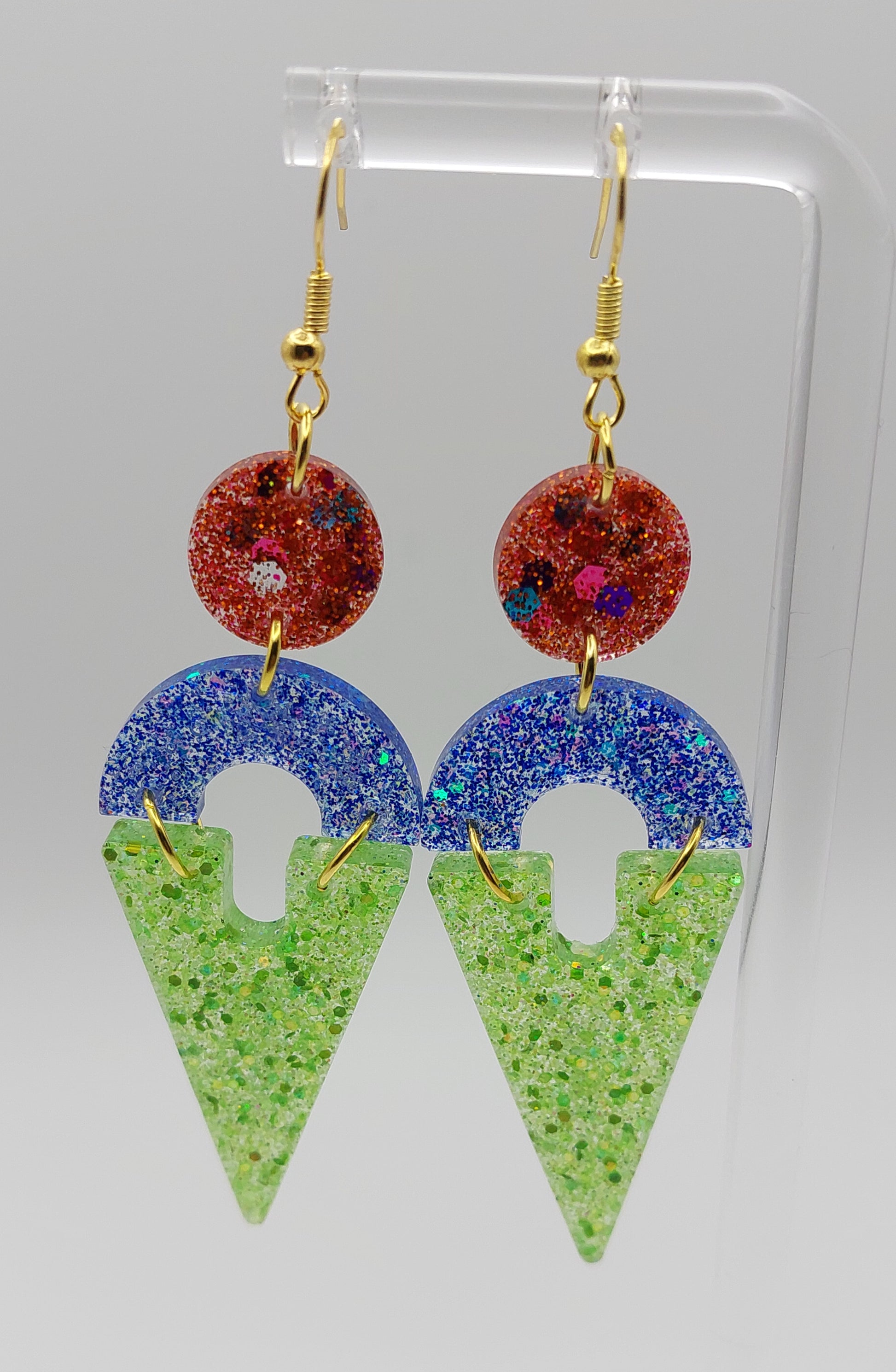 The captivating layered design features a vibrant red/orange glitter circle at the top, a striking blue glitter half-circle in the middle, and a dynamic green glitter triangle at the bottom. Approx length is 2.5 inches.